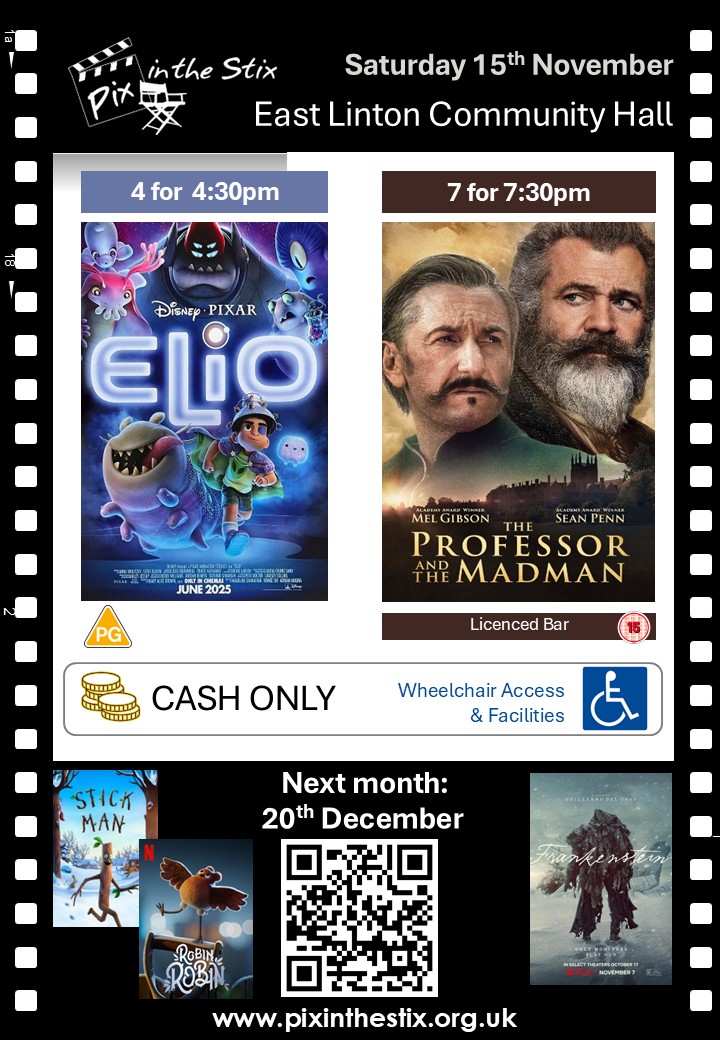 Children under 12 must be accompanied by an adult. Pix in the Stix is your very own volunteer run Cinema. Children under 12 MUST be accompanied by an adult Volunteers are always needed on film nights and to join the committee. All information subject to change Times shown are the Entry Times for films |