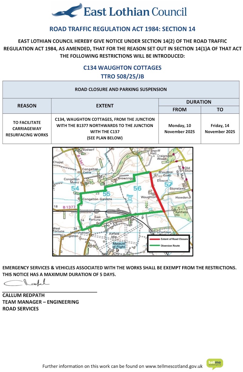 From Waughton Cottages (U171) To Waughton Steading, Whitekirk, North Berwick Promoter:East Lothian Council Telephone: Email: Website: 10/11/2025 - 14/11/2025 - Description: Carriageway Repairs