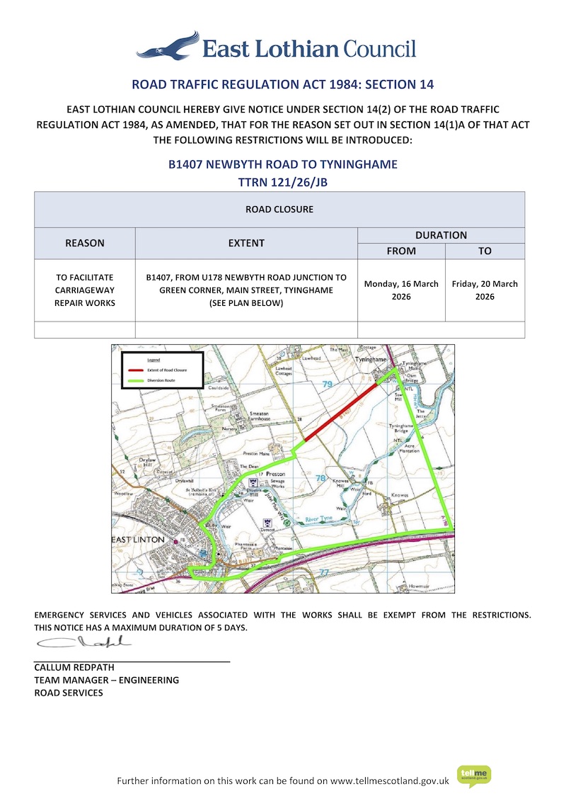 East Lothian Council are planning to undertake carriageway repair works on the U187 Limetree Walk. The works are now programmed to start w/c Monday 1st December 2025 for a duration of up to 3 weeks. To comply with current health & safety legislation, a temporary road closure will be in place for the duration of the works, from Monday 1st December to Friday 19th December 2025. Emergency vehicle access will be maintained at all times.